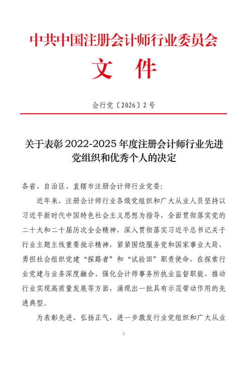 近日,收到中共中國注冊會計師行業(yè)委員會文件《關(guān)于表彰2022-2025年度注冊會計師行業(yè)先進黨組織和優(yōu)秀個人的決定》,我所主任會計師吳林海同志榮獲注冊會計師行業(yè)“優(yōu)秀黨務(wù)工作者”稱號。 此次榮獲“優(yōu)秀黨務(wù)工作者”稱號,不僅是對其個人工作的認可,也是對我所黨建工作的高度肯定。 我所將以此次獲獎為契機,進一步加強黨建工作,深化黨建與業(yè)務(wù)融合,提升服務(wù)質(zhì)量,堅守職業(yè)道德,不斷增強服務(wù)國家戰(zhàn)略、服務(wù)經(jīng)濟發(fā)展、服務(wù)社會公眾的能力。 附件: